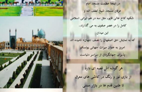 مسجد شیخ لطف الله : اصفهان، ورودی غربی دروازه دولت (میدان امام حسین)، خیابان سپه، میدان نقشجهان،داخل میدان نقش جهان قرار دارد ۳۰۰ نفر گردشگری مدیا