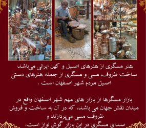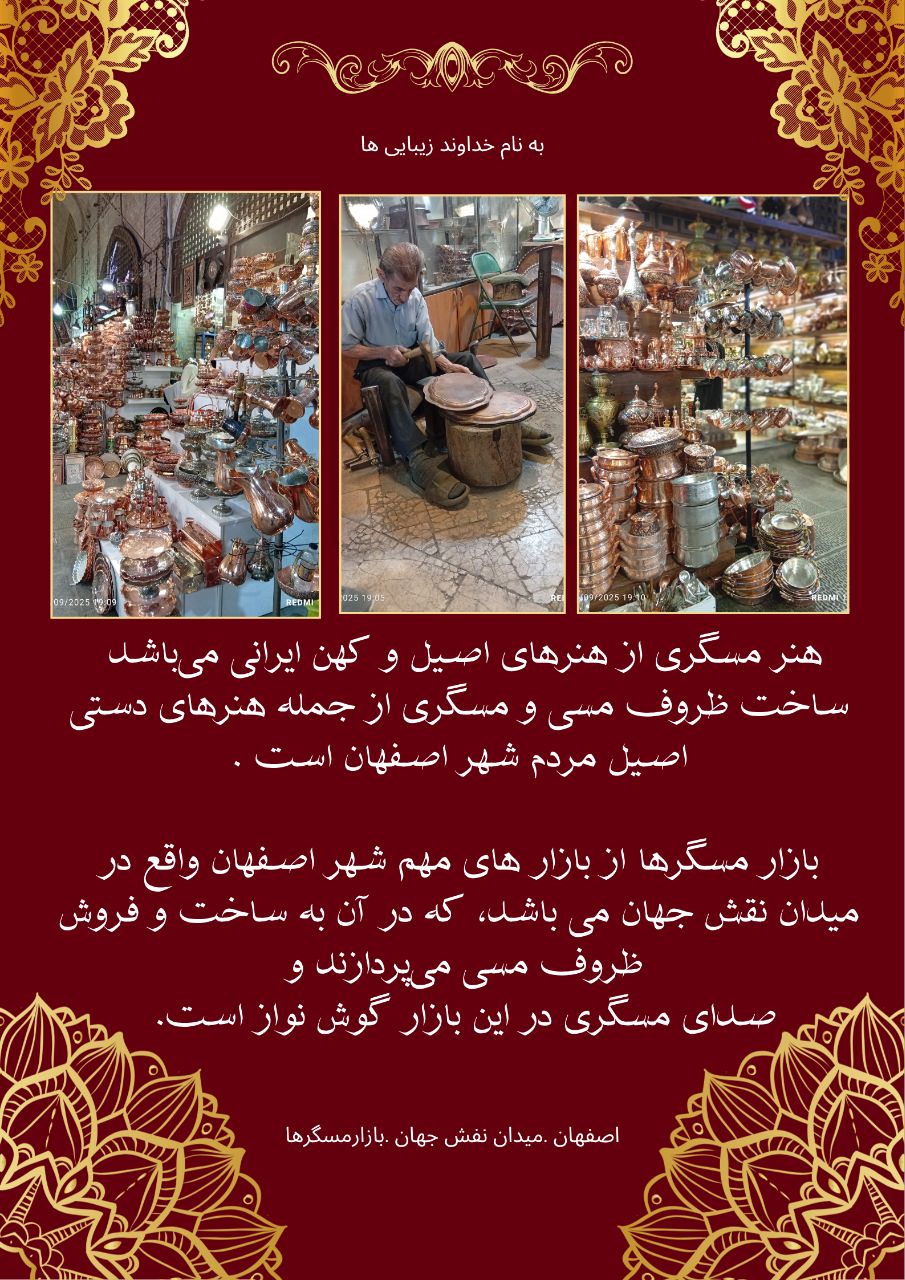 بازار مسگری اصفهان ، میدان نقش جهان، بازار مسگرها گردشگری خانواده 1 ماه پیش جزئیات نوع مرکز بازارها و فضاهای سنتی درباره این مرکز بازار خرید و فروش و ساخت و تولید ظروف مسی نمایش بیشتر نمایش کمتر جزئیات دسته مرکز: گردشگری خانواده موقعیت مکانی اصفهان ، میدان نقش جهان، بازار مسگرها نمای نقشه امکانات ورودی رایگان Google Nearby Places اولین نفری باشید که برای “بازار مسگری” نظر می دهد لغو پاسخ امتیاز نام ایمیل ذخیره نام، ایمیل و وبسایت من در مرورگر برای زمانی که دوباره دیدگاهی مینویسم. نقد و بررسی مراکز مرتبط پاساژ آرمان ایران استان خراسان رضوی، شهرستان مشهد، نواب صفوی، نرسیده به نواب صفوی 12 گردشگری خانواده مجموعه تفریحی آنا باغی ۱۵ کیلومتری میانه، در مسیر میانه به سمت ترک گردشگری خانواده بازار تاریخی اراک ایران اراک، محسنی، گذر چهارسوق بازار، مجموعه بازار تاریخی اراک (محلهی بافت تاریخی) گردشگری خانواده