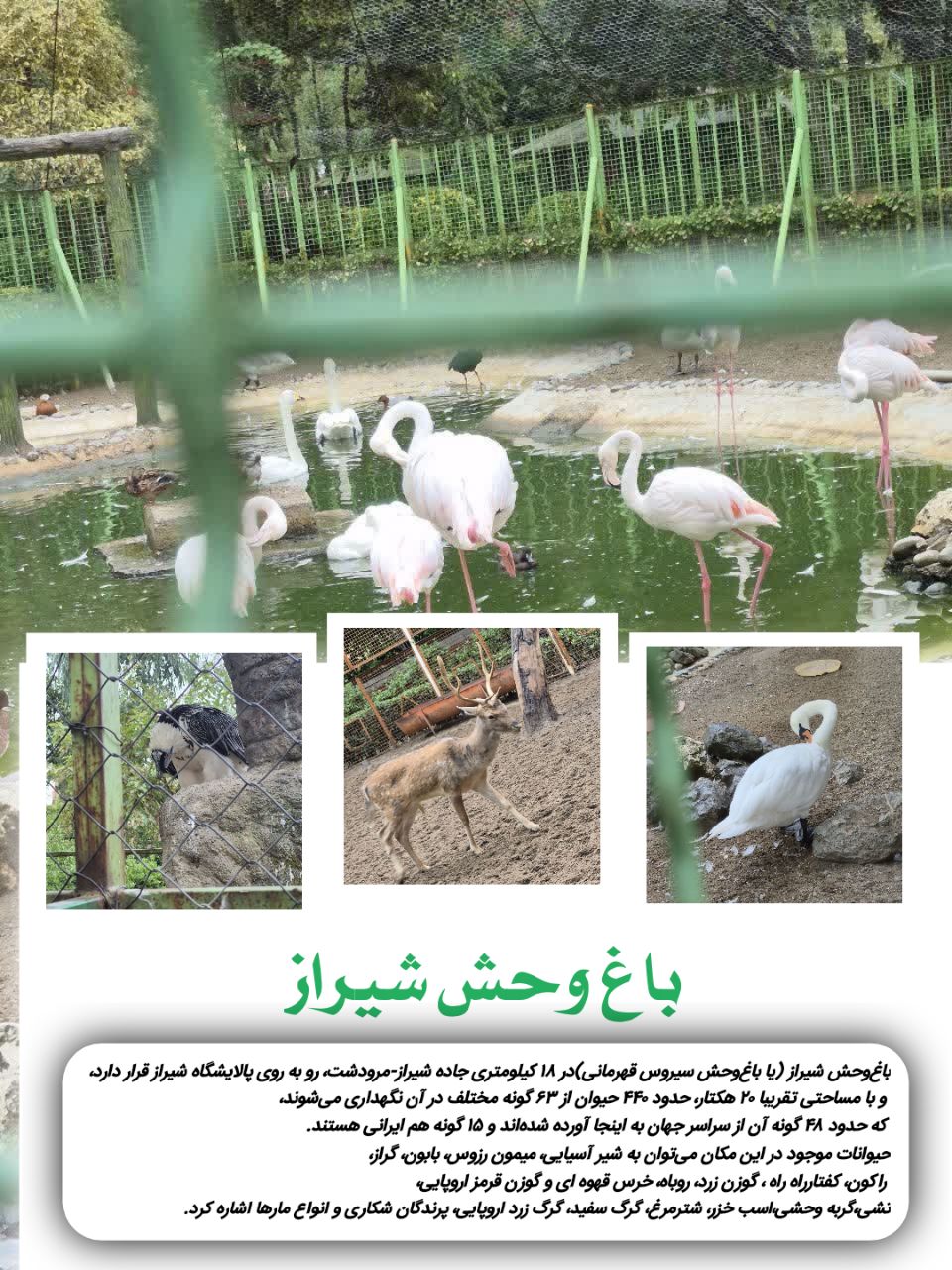 باغ‌وحش شیراز (یا باغ‌وحش سیروس قهرمانی) در ۱۸ کیلومتری جاده شیراز-مرودشت، رو به روی پالایشگاه شیراز قرار دارد، و با مساحتی تقریبا ۲۰ هکتار، حدود ۴۴۰ حیوان از ۶۳ گونه مختلف در آن نگهداری می‌‌شوند، که حدود ۴۸ گونه‌ آن از سراسر جهان به اینجا آورده شده‌‌اند و ۱۵ گونه‌ هم ایرانی هستند.از حیوانات موجود در این مکان می‌توان به شیر آسیایی، میمون رزوس، بابون، گراز، راکون، کفتارراه راه ، گوزن زرد، روباه، خرس قهوه‌ ای و گوزن قرمز اروپایی، تشی،گربه وحشی،اسب خزر، شترمرغ، گرگ سفید، گرگ زرد اروپایی، پرندگان شکاری و انواع مارها اشاره کرد.