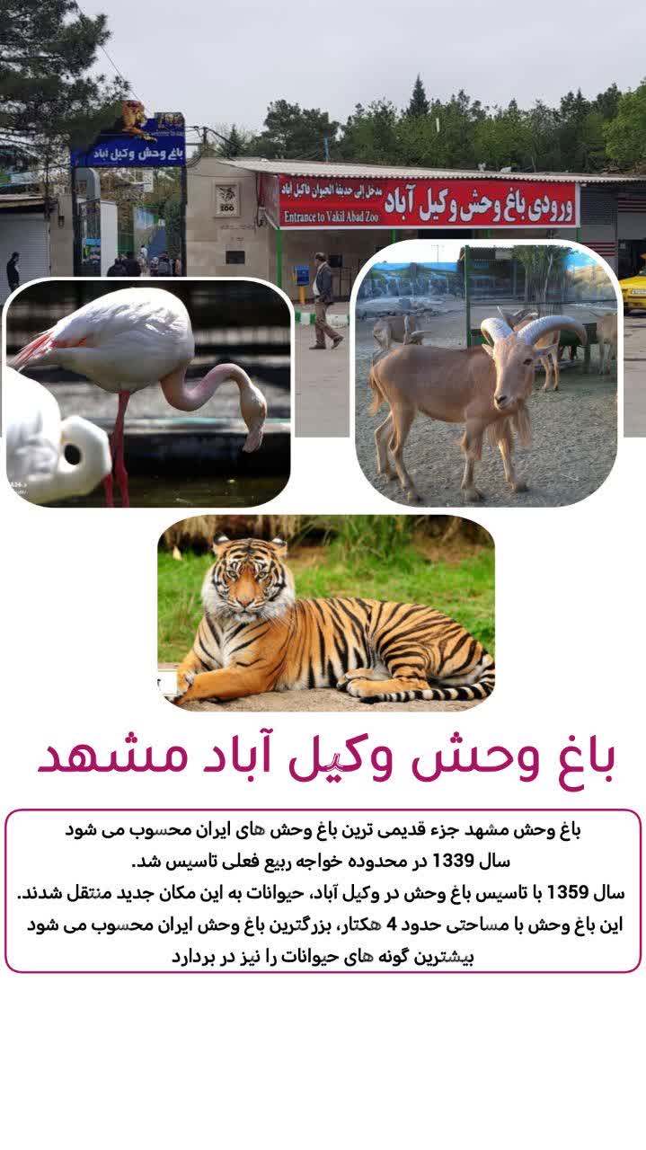 این باغ وحش که در مساحتی با بیش از 40 هزار متر مربع در مشهد واقع شده است، بزرگ ترین باغ وحش کشور به شمار می رود. در این باغ وحش 125 گونه مختلف شامل پستانداران، خزندگان و پرندگان مختلف وجود دارد که مجموعه متنوعی را برای بازدید ایجاد کرده است.برخی از مهم ترین حیوانات این باغ وحش شامل شیر، خوک، ببر، شامپانزه، گراز، لاما، خوک، گوزن، سیاه گوش، قوچ، شتر، انواع پرندگان و طوطی سانان مختلف است