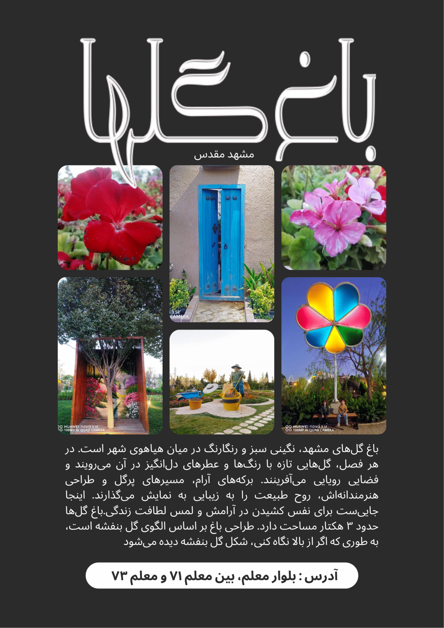 باغ گل‌های مشهد با مساحتی حدود سه هکتار برای بازدید عموم ساخته شده و طراحی آن به شکل گل بنفشه از نمای بالا دیده می‌شود.