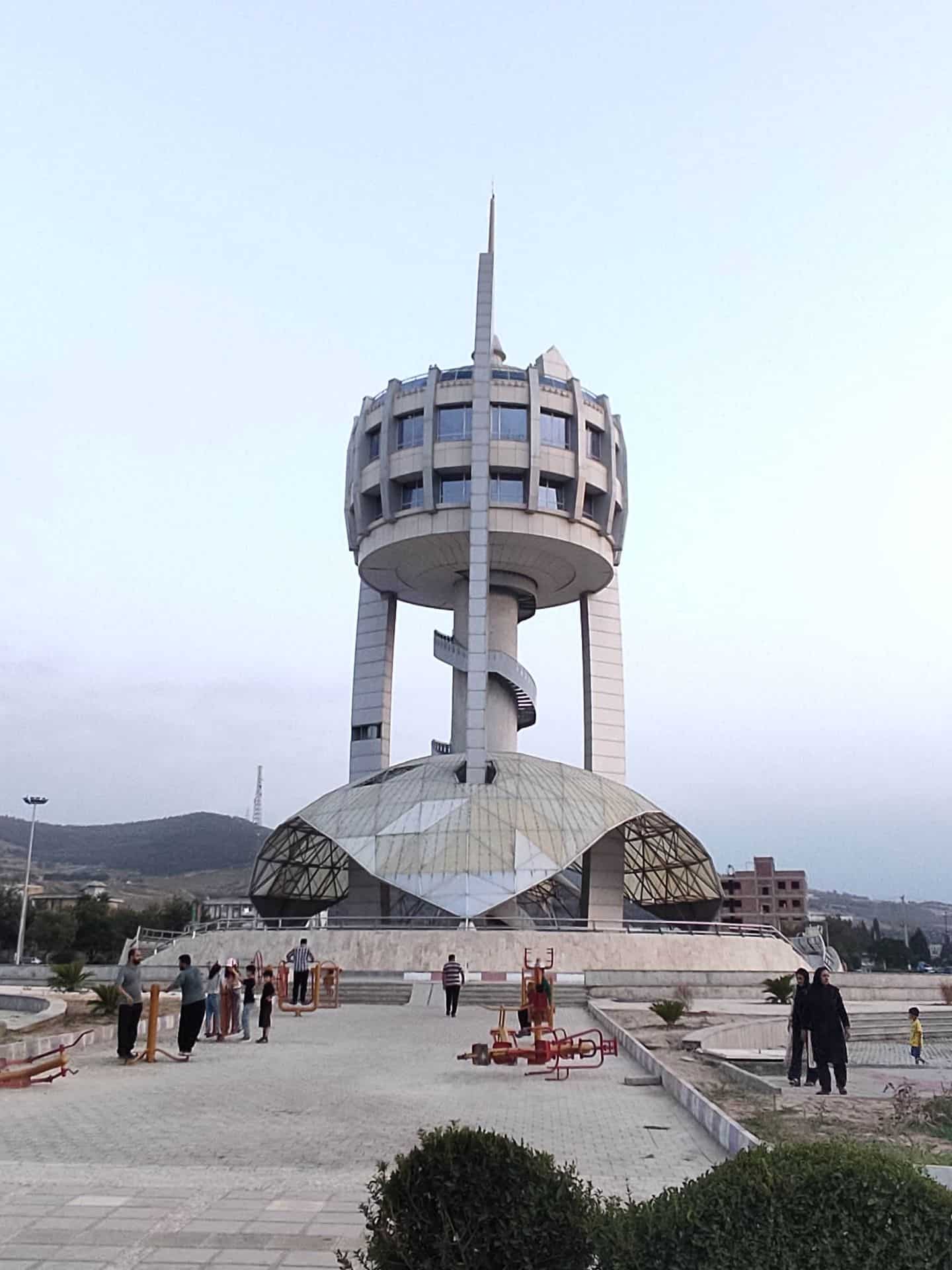 یکی از میدان تاریخی که بهش فلکه بسیج می گویند و دارای برج المان به صورت ترکیب سنگ وفلز ساخته شده و کافه رستوران المان دو طبقه ۵۷متری ودارای منوی غذای ایرانی وفرنگی می باشد. ویک طبقه زیرزمین که حدود۱۲غرفه فعال در زمینه گردشگری وصنایع دستی وسرویس بهداشتی مخصوص خانم واقاونمازخانه جداگانه می باشد.کافه رستوران اسانسور وپله مارپیچی دارد .میدان دارای پارکینگ خودرو وفضای سبز و ابشاروحوضچه ومیز وصندلی برای استراحتگاه مسافرین گرامی وفضای استراحت وخواب درصورت داشتن چادر امکان پذیراست.ورودی زیر گذر افراد پیاده به میدان نیز سمت غربی فعال است.در این عکس گه شب گرفته شده جلوه های زیبایی ونور ویک وسوم رعایت شده است.