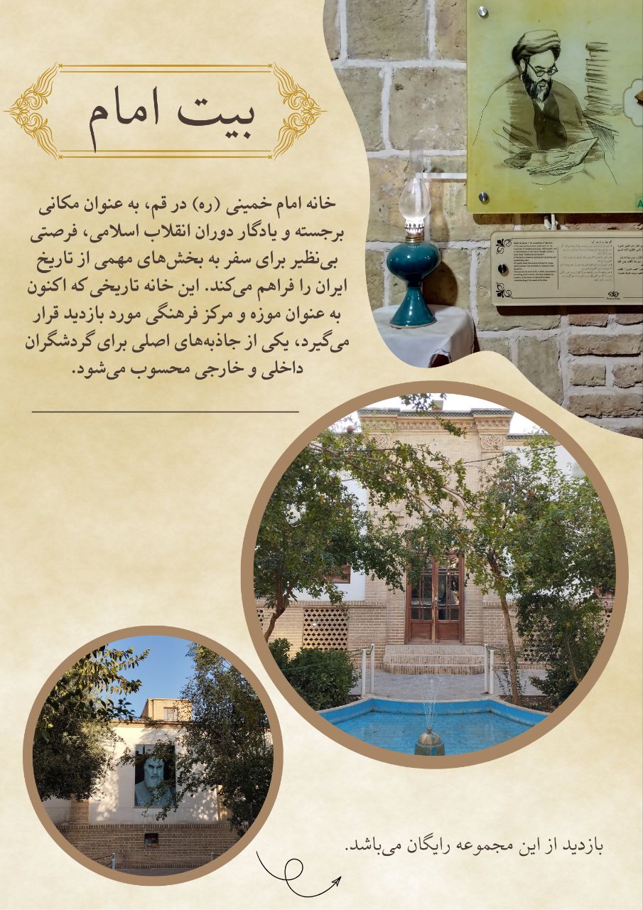 خانه تاریخی امام خمینی (ره) در قم در دوره پیش از تبعید، محل سکونت ایشان بوده است. در این خانه که به سبک سنتی ایرانی بنا شده، میتوانید از اتاقهایی بازدید کنید که امام خمینی در آنها زندگی و فعالیتهای انقلابی خود را برنامهریزی میکرد. این مکان، بازدیدکنندگان را با زندگی ساده و معنوی امام خمینی آشنا میکند و فرصتی برای دیدن آثار شخصی و اسناد تاریخی مرتبط با ایشان فراهم میسازد.