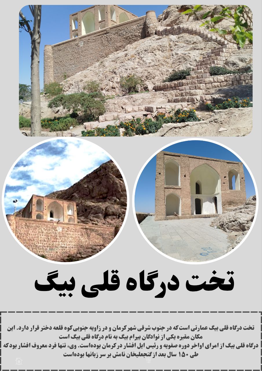 تخت درگاه قلی بیگ عمارتی است که در جنوب شرقی شهر کرمان و در زاویه جنوبی کوه قلعه دختر قرار دارد. این مکان مقبره یکی از نوادگان بیرام بیگ به نام درگاه قلی بیگ است. درگاه قلی بیگ از امرای اواخر دوره صفویه و رئیس ایل افشار در کرمان بودهاست. وی، تنها فرد معروف افشار بود که طی ۱۵۰ سال بعد از گنجعلیخان نامش بر سر زبانها بودهاست