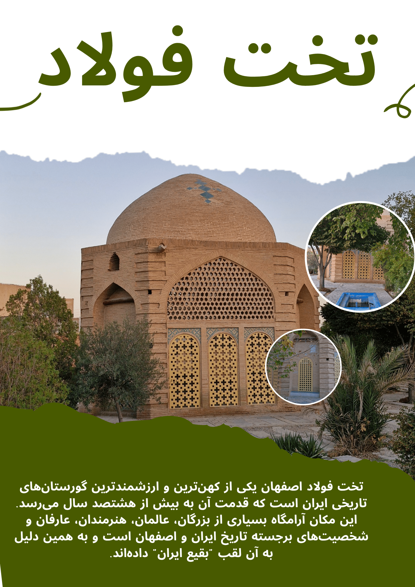 تخت فولاد اصفهان یکی از کهنترین و ارزشمندترین گورستانهای تاریخی ایران است که قدمت آن به بیش از هشتصد سال میرسد. این مکان آرامگاه بسیاری از بزرگان، عالمان، هنرمندان، عارفان و شخصیتهای برجسته تاریخ ایران و اصفهان است و به همین دلیل به آن لقب “بقیع ایران” دادهاند.