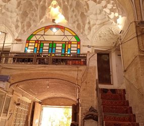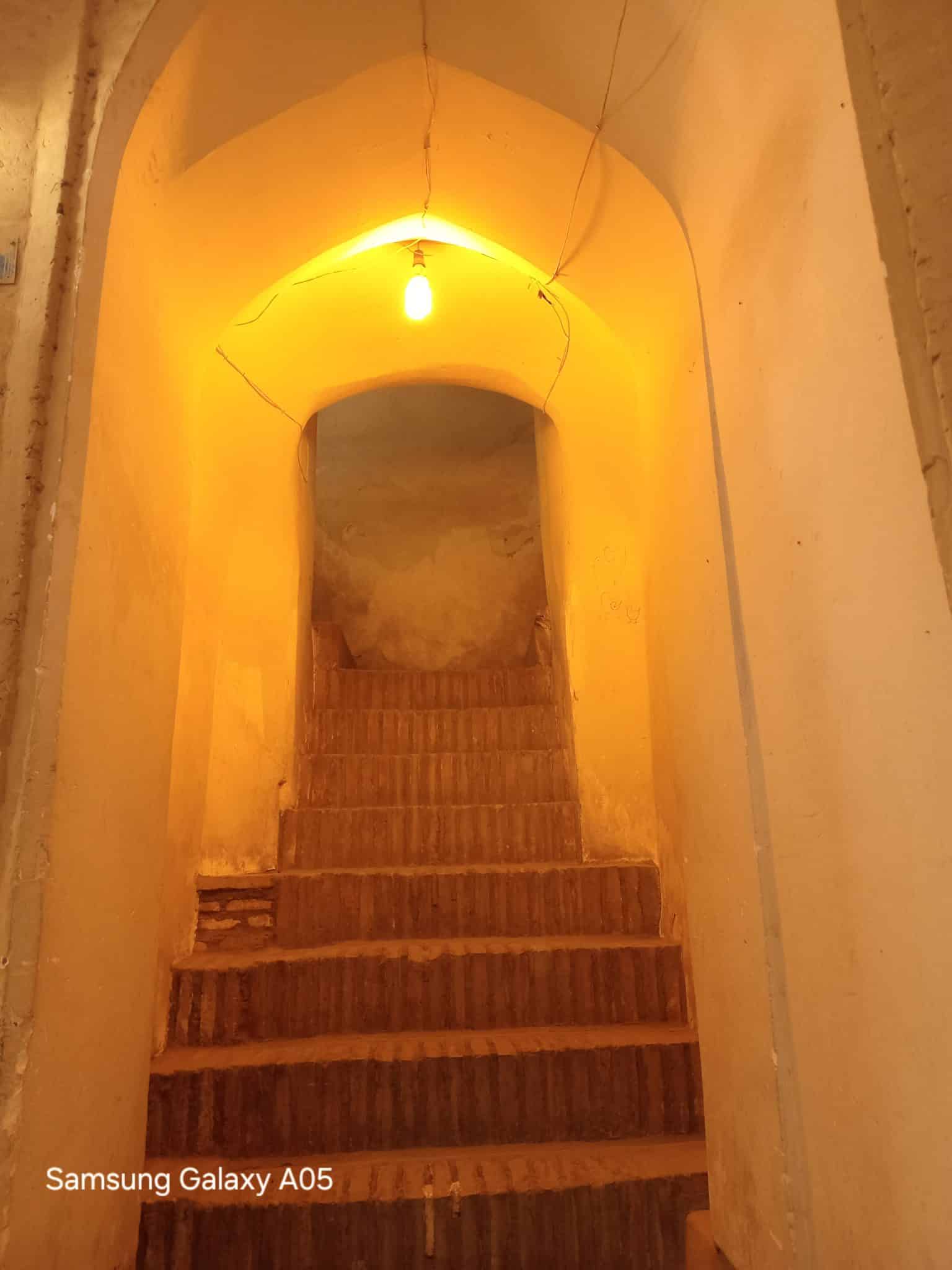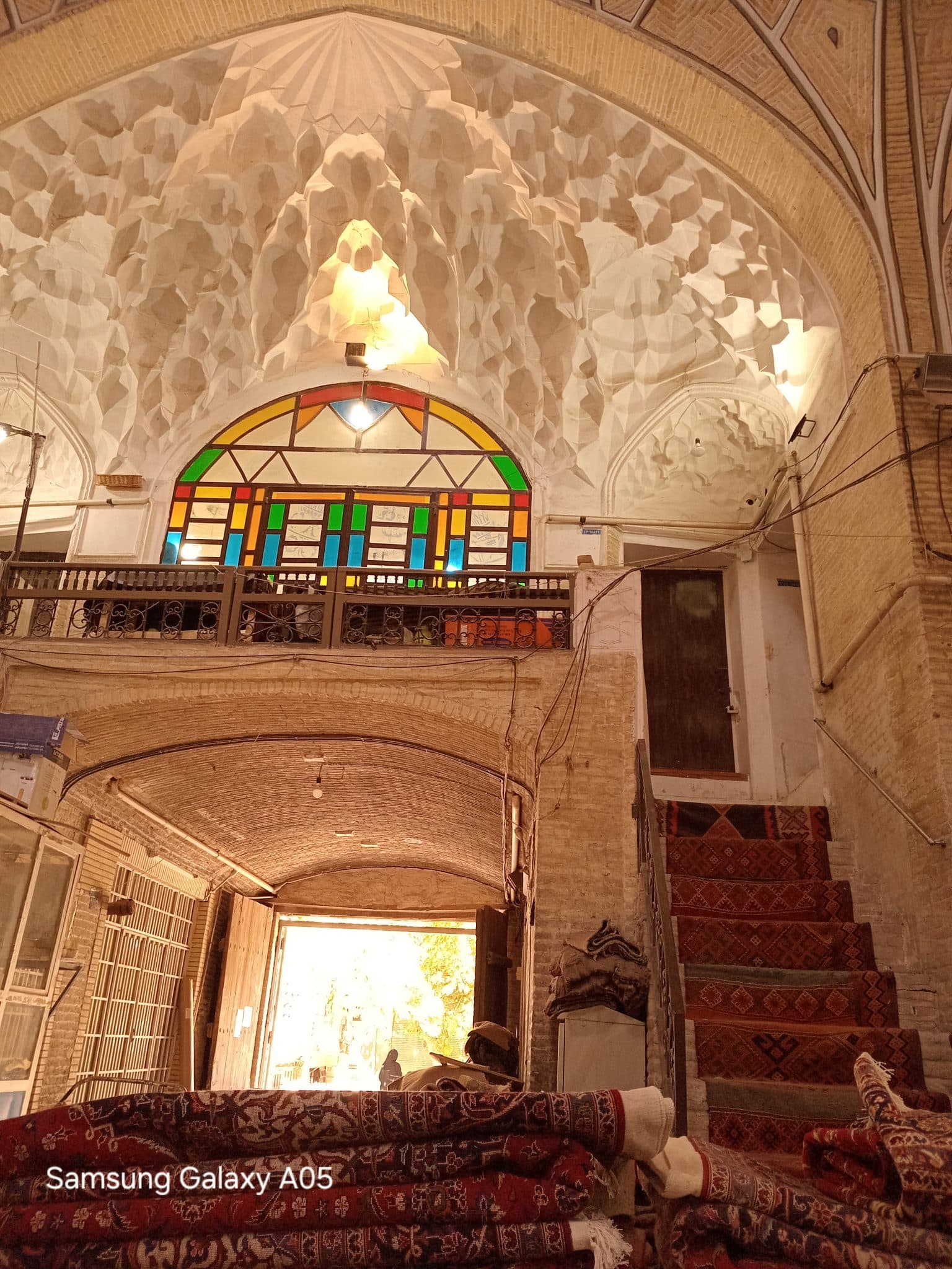 حجرههای فرشفروشی در دو طبقه دورتادور تیمچه را پر کردهاند. راهروهای باریک و دالانمانند با پلههای قدیمی آجری، تو را به طبقه دوم هدایت میکنند.