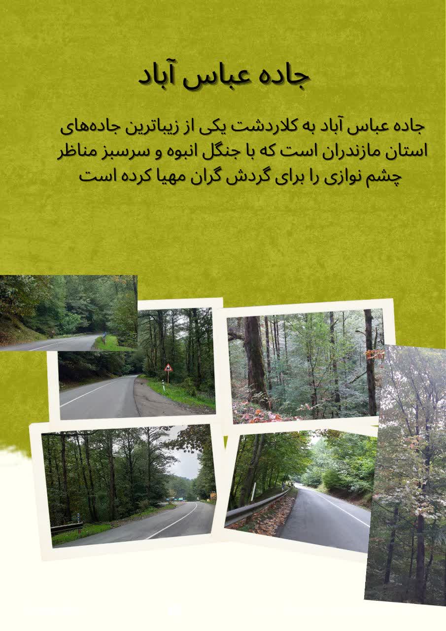 جادهٔ عباس آباد به کلاردشت یکی از جذابترین جادههای استان مازندران است که با جنگلهای زیبای انبوه در هر فصل سال با رنگآمیزیهای شگفتی مناظر خیره کننده و چشم نوازی را برای گردش گران مهیا کرده است.