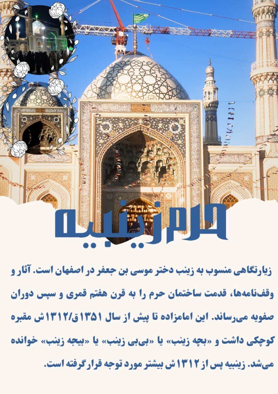 مقبره زینبیه در چهار دوره توسعه یافت. دو دوره آن پیش از انقلاب اسلامی ایران (۱۳۵۷ش) و دو دوره پس از تاریخ یادشده است. زینبیه در هر دوره نسبت به دوره قبل از گستردگی و امکانات بیشتری برخوردار شد. در آخرین مرحله، طرح توسعه زینبیه با مشارکت شهرداری اصفهان اجرا شد.مساحت حوزه زیارتی طرح توسعه اخیر حرم، چهار هکتار و زیرینای کل طرح ۸۵۰۰۰ مترمربع است. همچنین مساحت بقعه ۱۵۰۰ مترمربع و دارای زیربنای ۲۴۰۰ مترمربع است. بقعه از سه طرف به سه صحن شرقی و غربی و جنوبی دسترسی دارد. مساحت صحن امام رضا(ع) ۸۵۰۰ مترمربع و مساحت صحن شرقی و غربی هر کدام ۱۵۰۰ مترمربع و دارای شبستانی در زیر صحن است.