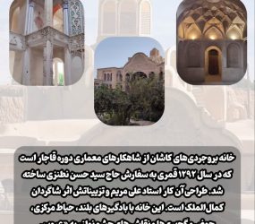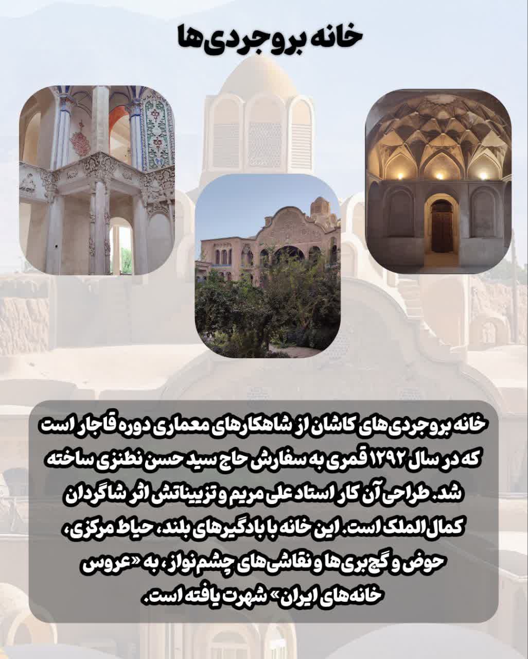خانه بروجردیها در کاشان یکی از شاهکارهای معماری دوره قاجار است که در حدود سال ۱۲۹۲ قمری ساخته شد. این خانه متعلق به یکی از بازرگانان مشهور کاشان بود و به سفارش او برای همسرش بنا شد. معمار آن استاد علی مریم است که خانه طباطباییها را نیز طراحی کرده بود. ویژگیهای برجسته خانه شامل بادگیرهای بلند، حوضخانه زیبا، نقاشیهای دیواری استاد صنیعالملک و گچبریهای چشمنواز است. طراحی این بنا به گونهای است که تابستانها خنک و زمستانها گرم باشد. این خانه سه بخش اندرونی، بیرونی و خدمه دارد و امروز به عنوان یکی از آثار ملی ایران و جاذبههای گردشگری کاشان شناخته میشود.