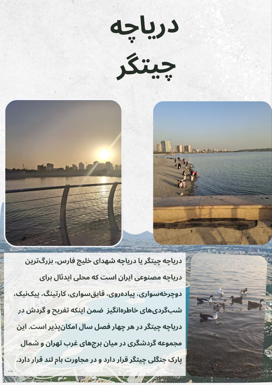 دریاچه چیتگر یا دریاچه شهدای خلیج فارس، بزرگترین دریاچه مصنوعی ایران است که محلی ایدئال برای دوچرخهسواری، پیادهروی، قایقسواری، کارتینگ، پیکنیک، شبگردیهای خاطرهانگیز و همین طور قرارهای عاشقانه محسوب میشود. ضمن اینکه تفریح و گردش در دریاچه چیتگر در هر چهار فصل سال امکانپذیر است. این مجموعه گردشگری در میان برجهای غرب تهران و شمال پارک جنگلی چیتگر قرار دارد و در مجاورت بام لند قرار دارد.