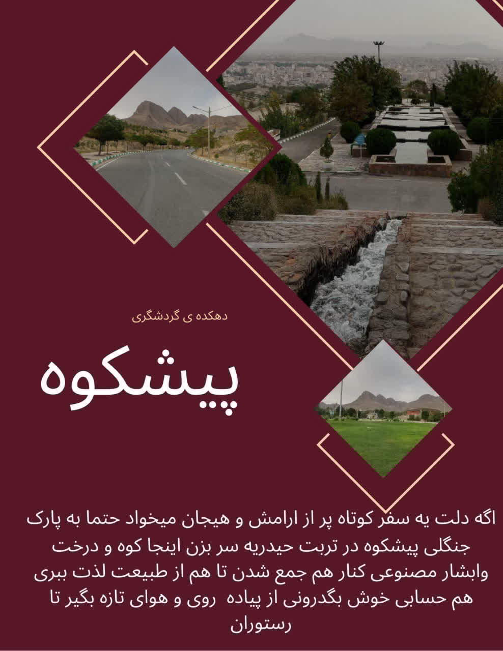 پارک جنگلی پیشکوه که از جاهای دیدنی تربت حیدریه و از بزرگ ترین پارک های استان خراسان رضوی شناخته می شود، در حدود ۸۰۰ کیلومتر وسعت دارد. این پارک که یک پارک کوهستانی به حساب می آید و در دامنه کوه قرار گرفته دارای جایگاه خاصی در استان خراسان و منطقه شرق کشور است. پارک جنگلی پیشکوه در دامنه کوه سه قله قرار دارد از اینرو این پارک را بوستان کوهستانی نیز می نامند.
