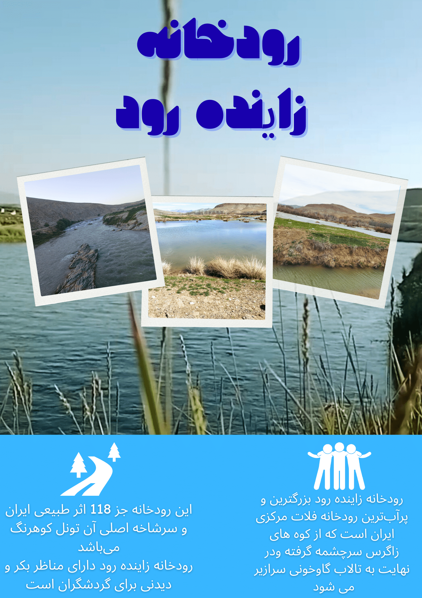 رودخانه زاینده رود بزرگترین و پرآبترین رودخانه فلات مرکزی ایران است که از کوه های زاگرس مرکزی به ویژه زرد کوه بختیاری در استان چهارمحال و بختیاری سرچشمه گرفته و در نهایت به تالاب گاوخونی سرازیر می شود.این رودخانه جز ۱۱۸ اثر طبیعی ایران قرار گرفته و سرشاخه اصلی این رودخانه تونل کوهرنگ است.