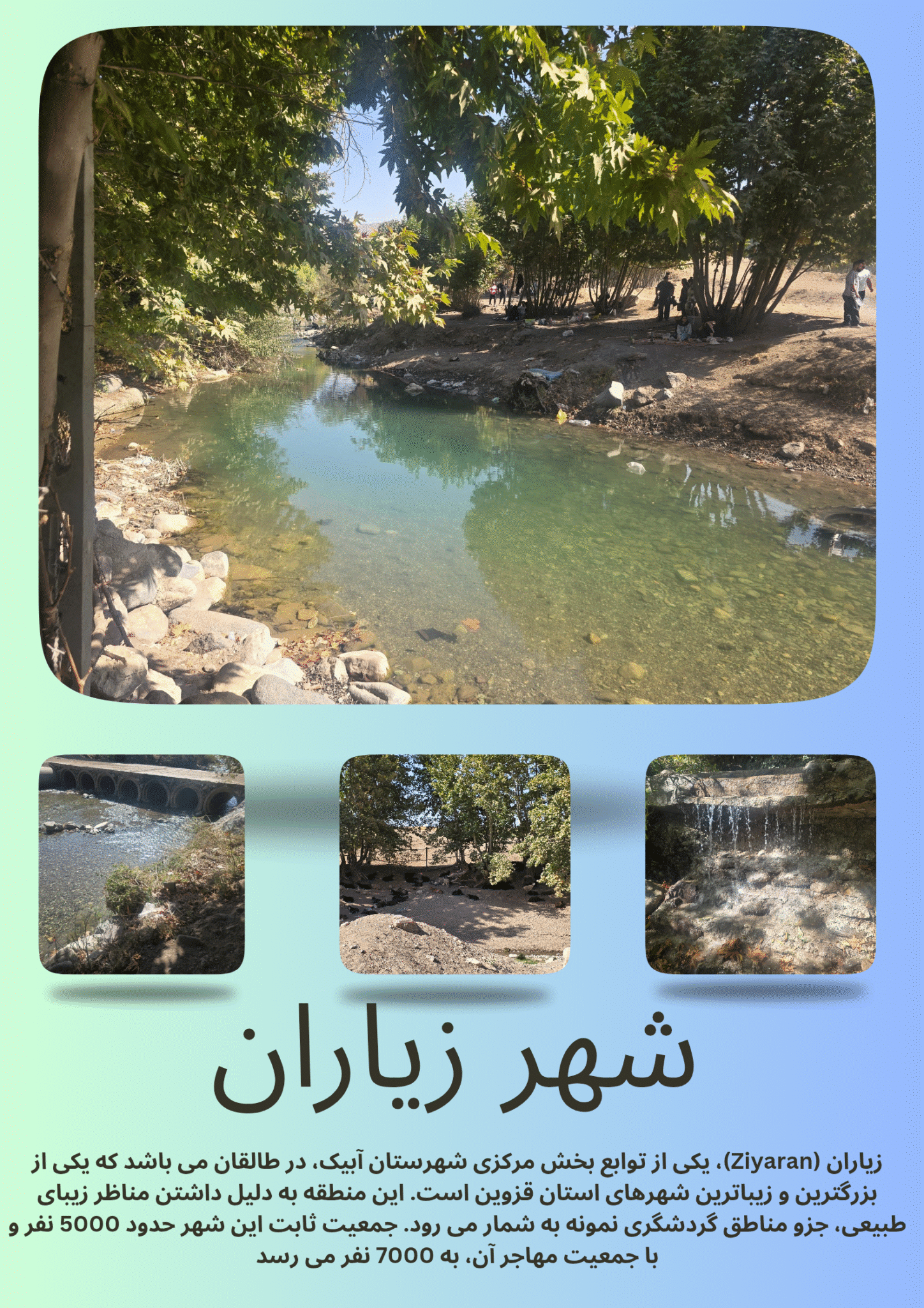 زیاران (Ziyaran)، یکی از توابع بخش مرکزی شهرستان آبیک، در طالقان می باشد که یکی از بزرگترین و زیباترین روستاهای استان قزوین است. این منطقه به دلیل داشتن مناظر زیبای طبیعی، جزو مناطق گردشگری نمونه به شمار می رود. جمعیت ثابت این روستا حدود 5000 نفر و با جمعیت مهاجر آن، به 7000 نفر می رسد