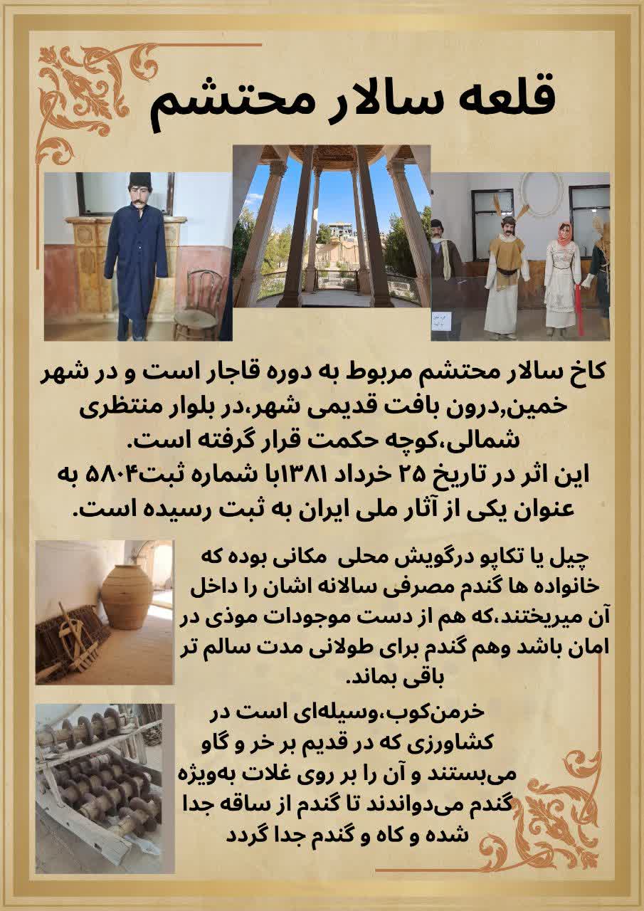 قلعه سالار محتشم از جاهای دیدنی خمین و از آثار ملی ایران به شمار می رود و موزه مردم شناسی خمین در آن دایر است.