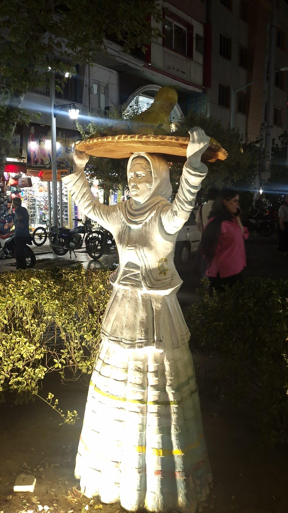 این مجسمه نماد زن گیلانی است که بر روی سرش مجمع(سینی) میوه های فصل پاییز را قرار داده و براب پیش کش میبرد