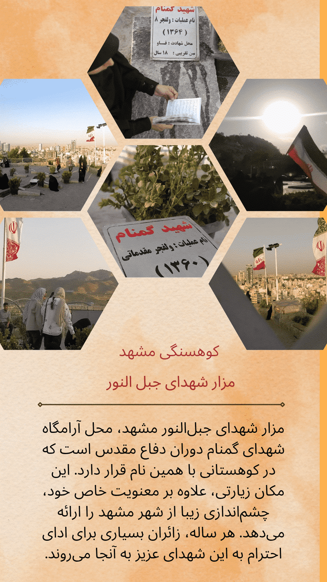 مزار شهدای جبل النور واقع در کوهسنگی ، روزانه شاهد بازدید بسیاری از زائران و مجاوران مشهد است