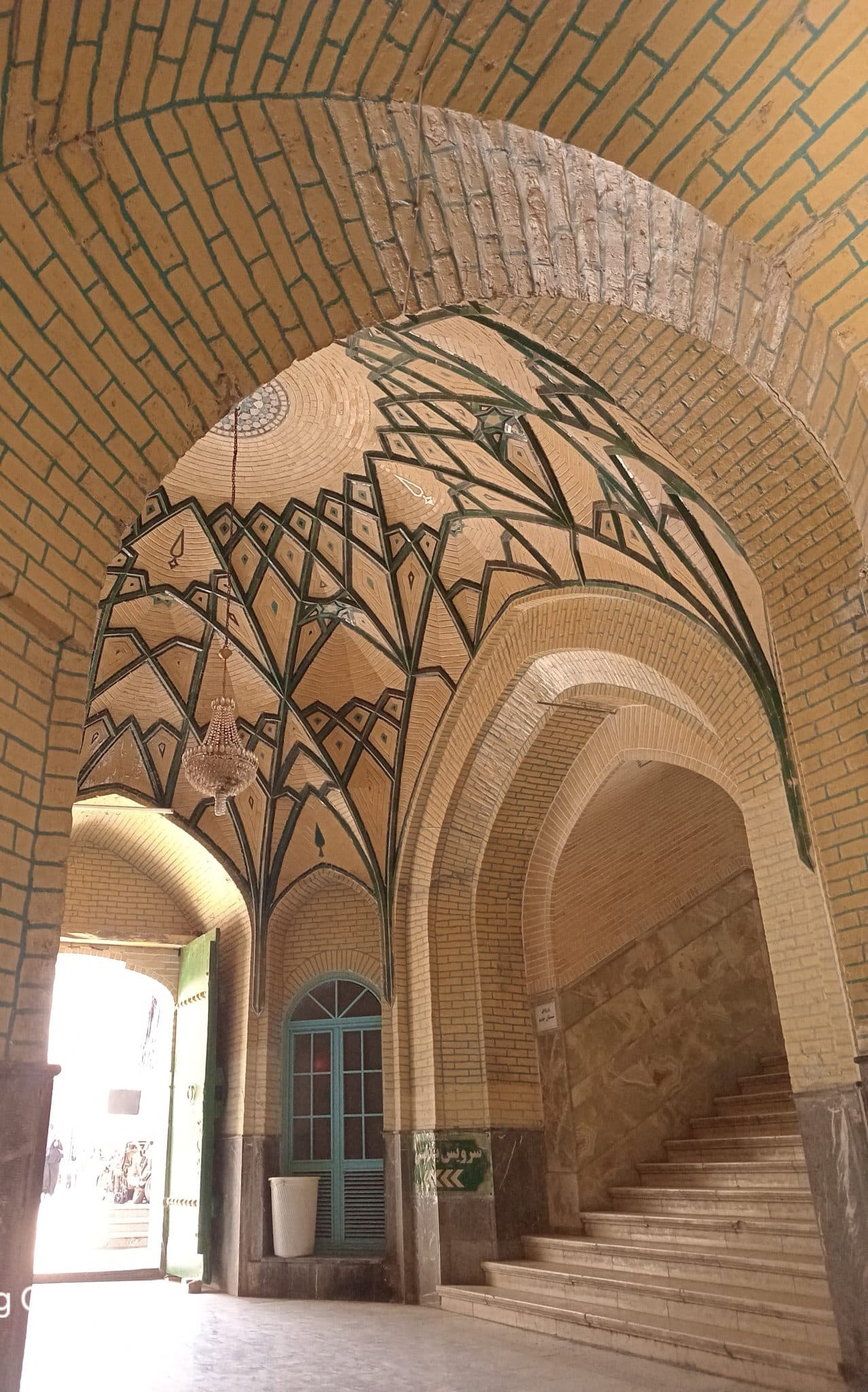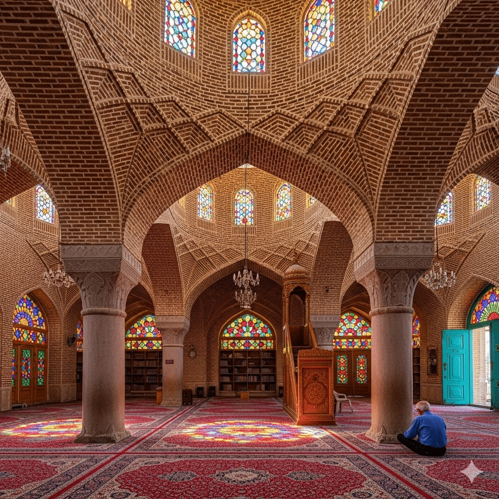 معماری بی‌نظیر مسجد با طاق‌ها و مقرنس‌های گچی، درب‌های چوبی سبز و کاشی‌کاری‌های آبی فیروزه‌ای فضایی روحانی و آرامش‌بخش ایجاد می‌کند.
