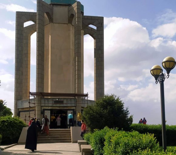 آرامگاه باباطاهر در شهر همدان در مرکز میدانی مستطیل شکل، زیبا، سرسبز، با گنبدی فیروزهای منشوری شکل، بر قاعدهای هشت ضلعی بر بالای تپهای کم ارتفاع قرار گرفتهاست. سقف آرامگاه کاشی کاری معرق میباشد. برج آرامگاه بر قاعدهای هشت ضلعی واقع شده که ارتفاع آن از سطح فوقانی تپه ۲۰/۳۵ متر و از کف خیابان ۲۵/۳۰ متر میباشد.