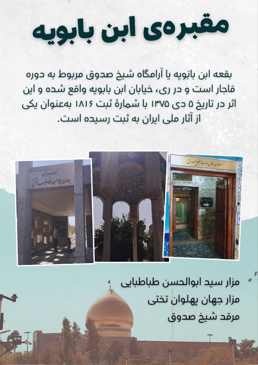 بزرگترین گورستان تهران که مشاهیر و دانشمندان زیادی در آن دفن هستند. از جمله مقبره ی شیخ صدوق و آرامگاه میرزا ابوالحسن طباطبایی و جهان پهلوان تختی و رجبعلی خیاط و….