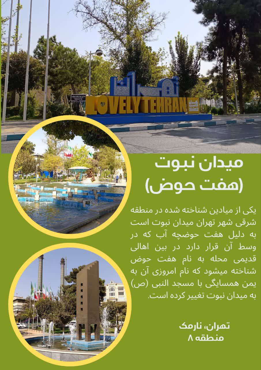میدان هفت حوض که اسم جدید آن به نام نبوت تغییر کرده است در شرق تهران قرار دارد که علاوه بر زیبایی های بصری در بخش مرکزی میدان، در اطراف آن مراکز خرید با تنوع فراوان قرار دارد.