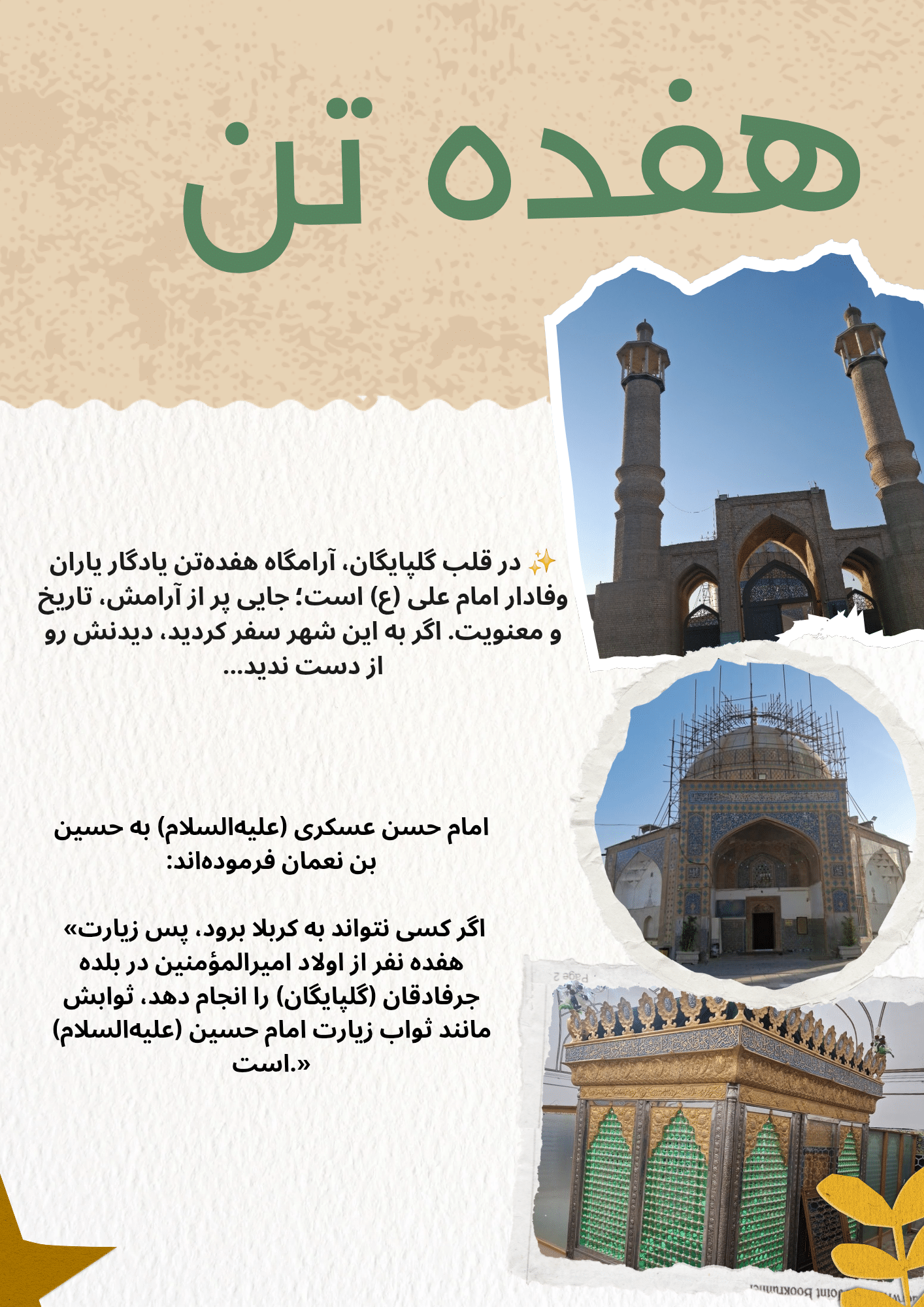 هفدهتن گلپایگان، مجموعهای تاریخی و مذهبی است که آرامگاه هفده تن از بزرگان و اولیای این شهر را در خود جای داده است. این مکان با معماری ساده اما دلنشین، فضایی آرام و معنوی برای بازدیدکنندگان ایجاد کرده و برای گردشگران علاقهمند به تاریخ و فرهنگ، فرصتی مناسب برای تجربهی گذر زمان و احترام به سنتهای دیرینه فراهم میکند.