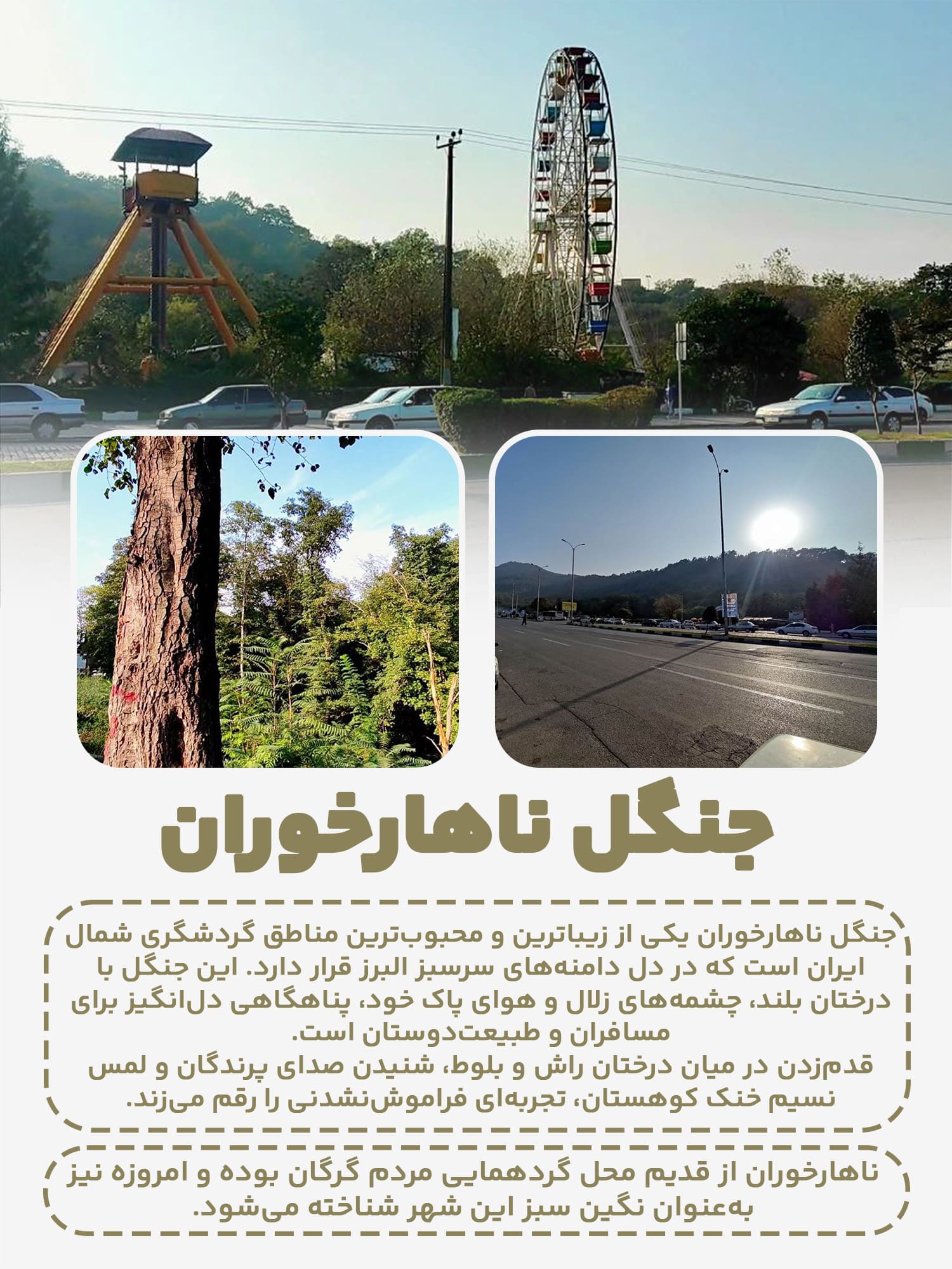 پارک جنگلی ناهارخوران جنوب شرقی گرگان قراردارد و مسافران از اقصی نقاط ایران به گرگان میایند واز مکانهای تفریحی سیاحتی استفاده میکنند واین مکان از دیرباز محل استراحت وتفریحی اخر هفته گرگانی ها بوده وهنوز هم این رسم دیرینه وجود دارد وغذا وخوراکی ونوشیدنی وجود دارد و کباب پزی هم اکبرجوجه هم از غذاهای خوشمزه گرگان است جنگل ناهار خوران باوسعت زیادی به دریای خزر میرسد وحتما برای واردشدن به جنگل باید راهنمای تور داشته باشید.