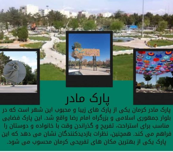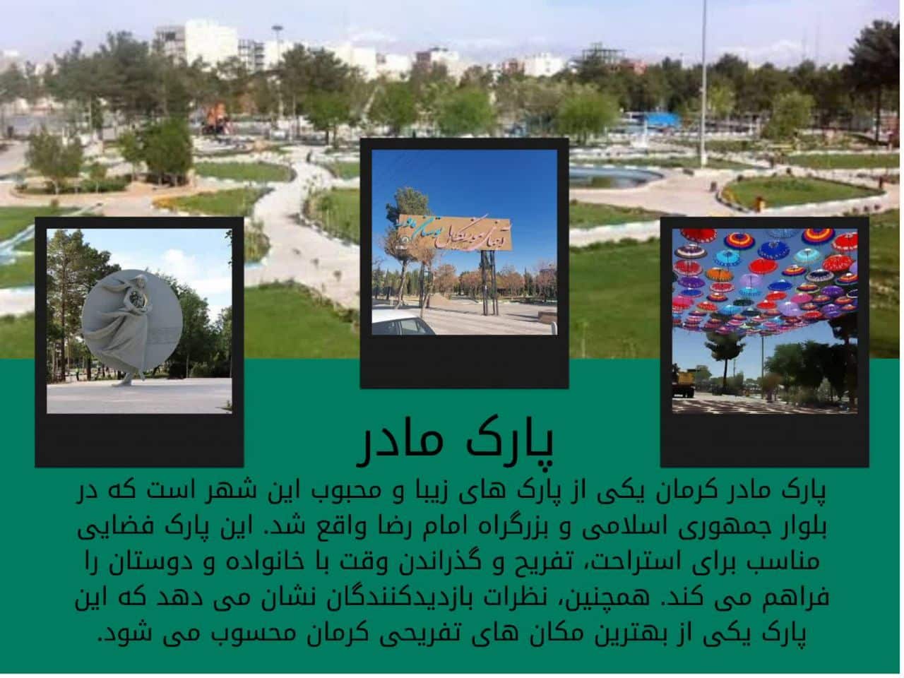 پارک مادر کرمان یکی از بوستان‌های بزرگ و محبوب این شهر است که در بلوار جمهوری اسلامی، بزرگراه امام رضا واقع شده. این پارک با فضای سبز گسترده، مسیرهای پیاده‌روی، زمین‌های بازی و امکانات تفریحی، محیطی مناسب برای خانواده‌ها و گردشگران فراهم کرده است.
