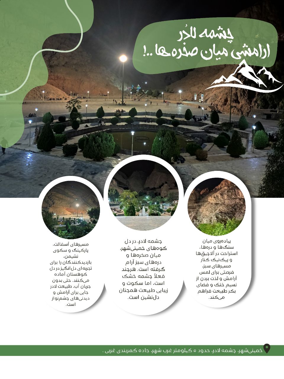 این چشمه در نزدیکی شهر اصفهان قرار دارد . چشمه ای میان کوه ها که البته چند سالیست دیگر از زمین نمی جوشد . فضاسازی این مکان برای گردش های خانوادگی و دوستانه بسیار مناسب و دلنشین است . تفریحاتی مانند زیپلاین، پلمعلق، تختفنر و… نیز برای گردشگران فراهم میباشد