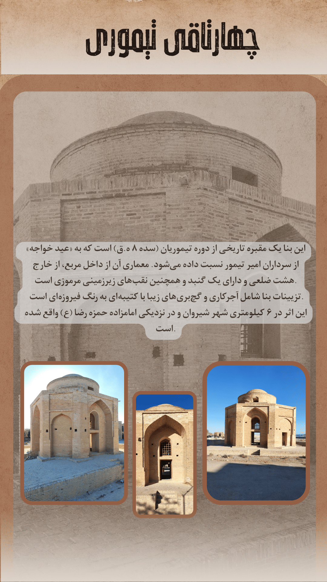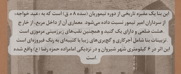 این بنا یک مقبره تاریخی از دوره تیموریان (سده ۸ ه.ق) است که به «عید خواجه» از سرداران امیر تیمور نسبت داده میشود. معماری آن از داخل مربع، از خارج هشت ضلعی و دارای یک گنبد و همچنین نقبهای زیرزمینی مرموزی است.