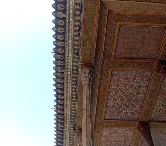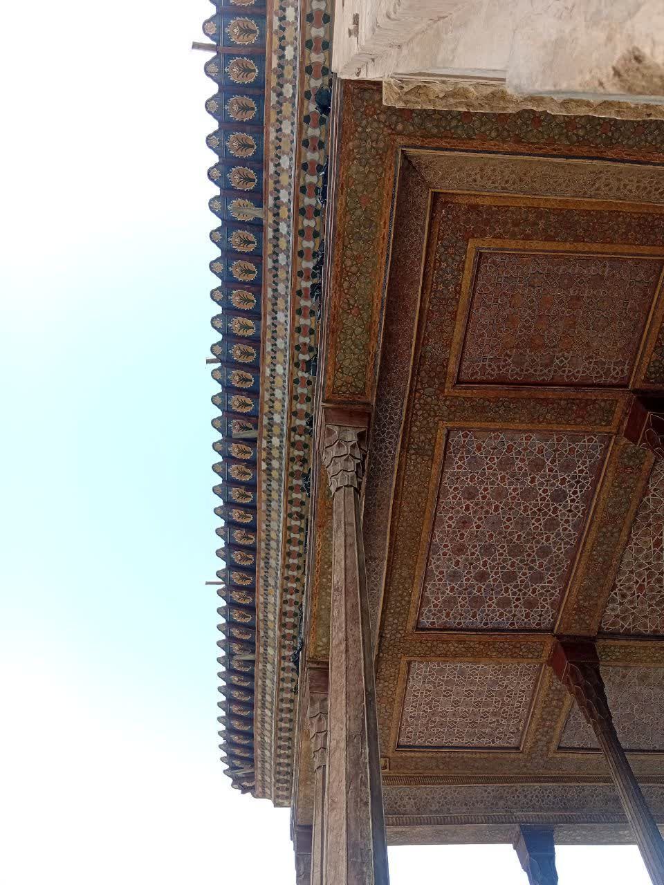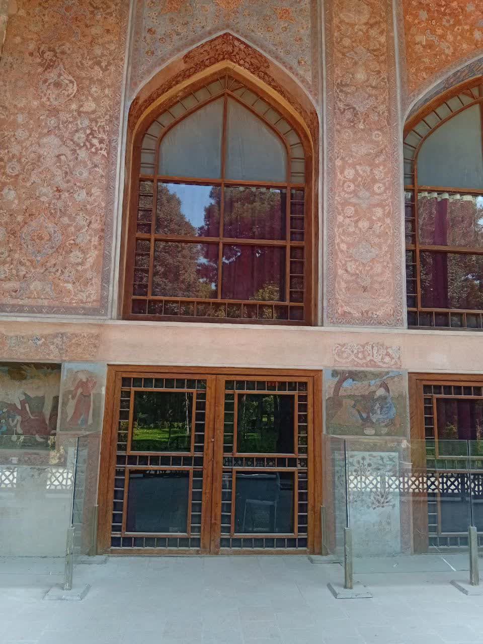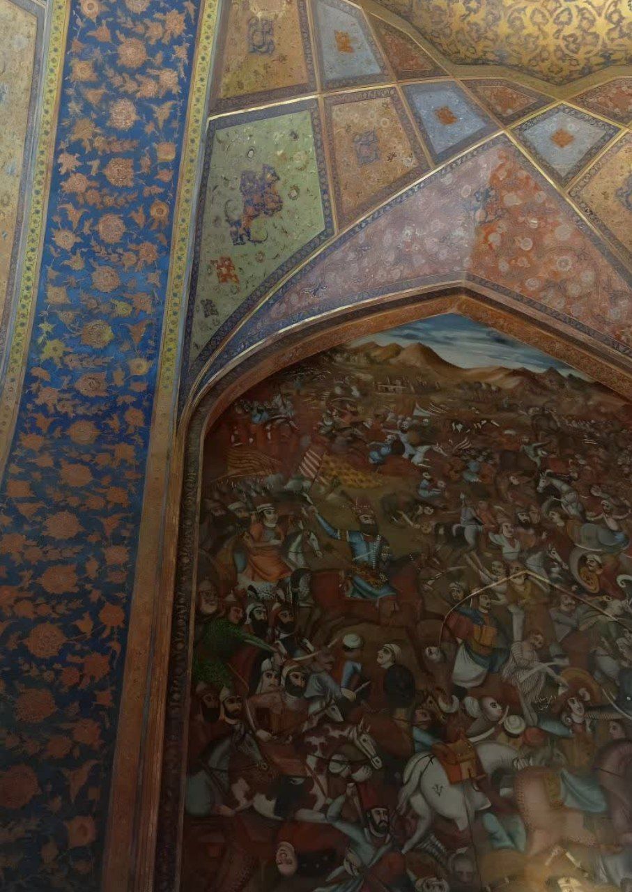 ایوان کاخ چهلستون مرکب از دو بخش است یک بخش که بر ۱۸ ستون چوبی و رفیع استوار است چهار ستون وسط که بر روی ۴ شیر سنگی قرار گرفته و حجاری آنها به گونهای است که دو شیر به یک سر انسان نشان داده میشود.[۶] جهش آب در حوض میان تالار از دهان چهار شیری که در چهار گوشه حوض قرار دارند و فوارههای سنگی مسیر جوی کوچک اطراف کاخ صفای مخصوصی به این قصر میداده است.[۷] قسمت دیگر که کمی مرتفع تر است سردر ورودی تالار را تشکیل میدهد و در بعضی منابع آن را تالار آینه نامیدهاند. این قسمت بر دو ستون قرار گرفته و سراسر آن مزین به آینهکاری وسیع و پرکاری است که در آن آینههای ریز و خوش نقش به صورت معرق در کنار آینههای قدی و خشتی به کار رفتهاند.[۶] سقف ایوان نیز با نقاشیهای گوناگونی که در قابهای چوبی ظریفی به اشکال مختلف هندسی محصور شدهاند تزیین یافته است. تصویر قرینه حوض مرمرین وسط ایوان در تزئینات سقف مشاهده میشود. این قرینهسازی شباهت بسیاری با ایوان عالیقاپو دارد.