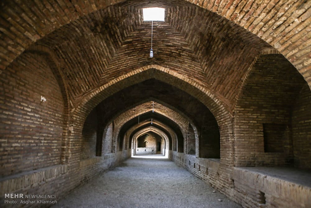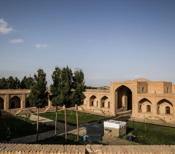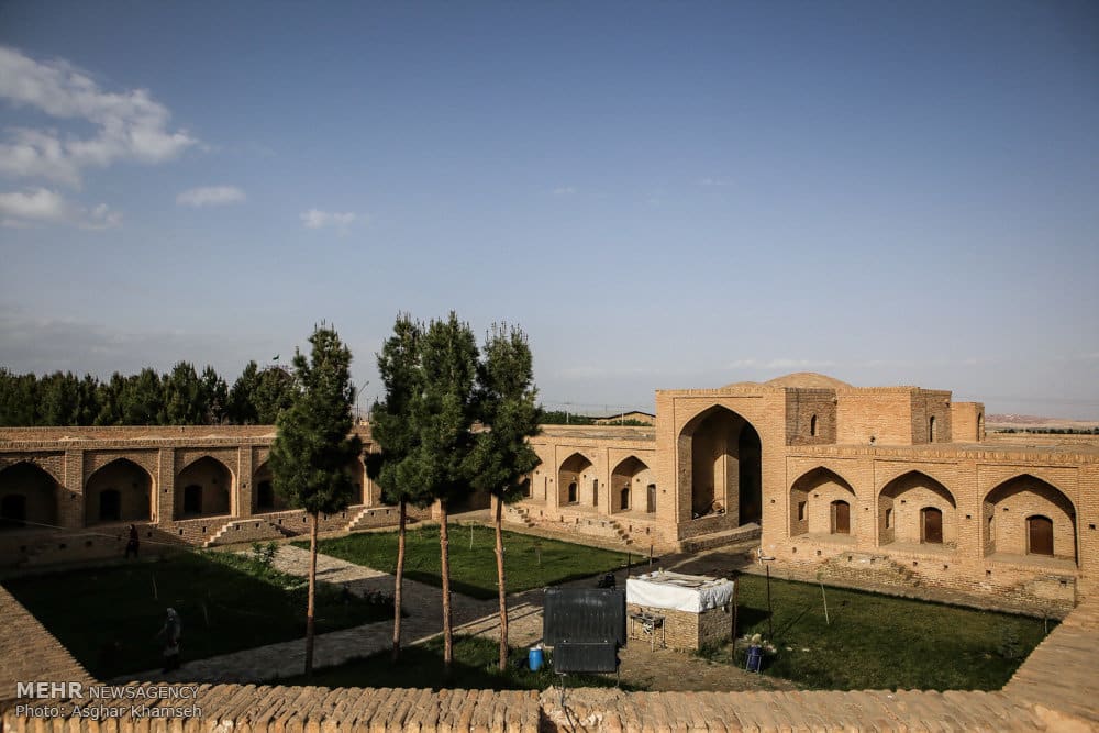 این کاروانسرا در حدود قرن یازدهم هجری قمری و به دستور شاه عباس صفوی ساخته شد تا زائرانی که از مسیر قدیم نیشابور – مشهد عبور میکردند، مکانی امن برای اقامت و استراحت داشته باشند. بنای کاروانسرا دارای حیاط مرکزی وسیع، حجرههایی در اطراف، ایوانهای بلند و دیوارهایی ضخیم از خشت و آجر است. تزئینات آجری، طاقهای هلالی و ایوانهای قرینه از ویژگیهای شاخص این بنای تاریخی محسوب میشوند.